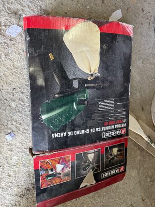 Pistola neumática de chorro de arena Parkside, modelo Posp 1000 B2. Se encuentra en su caja original, que presenta señales de desgaste por el paso del tiempo. - Marca: Parkside - Modelo: Posp 1000 B2 - Incluye accesorio para recoger el polvo.