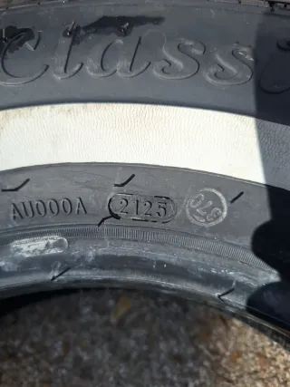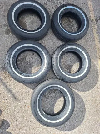 Conjunto de neumáticos con una distintiva banda blanca en el lateral. De la marca Radar modelo dimax classic medidas 185/70 R13. Prácticamente nuevas. - Banda blanca visible en el flanco. - Diseño de banda de rodadura clásico.