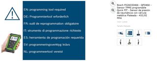 Sensor de presión de neumáticos Bosch F026C00466 - programable. Funciona a 433,92 MHz. Es de color plateado. Se necesita herramienta de programación para su uso. Incluye 2 piezas. Lo vendo porque pensaba que era compatible con mi coche, y cuando coprobé que no, ya se había pasado el plazo de devolución. EL PAQUETE ESTÁ TAL CUAL LO RECIBÍ, contiene DOS UNIDADES por un importe de 50€.
