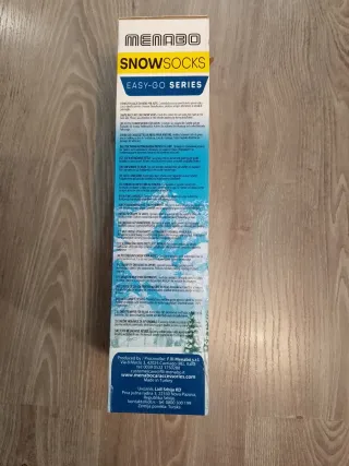Fundas para la nieve MENABO, modelo Easy-Go Series. - Talla XL. - Certificación EN 16662-1. - Homologadas para 40 km/h (25 mph). - Compatibles con ABS/ESP. - Instalación rápida en 3 minutos. - Diseño 3D para mayor tracción.