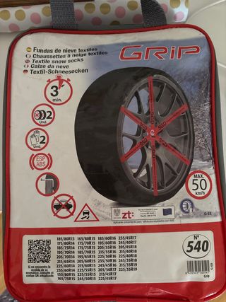 Fundas textiles para la nieve de la marca GRIP. Son una alternativa a las cadenas tradicionales. - Incluye 2 fundas. - Montaje rápido en 3 minutos. - Válidas para ABS y ESP. - Velocidad máxima: 50 km/h. - Talla: 540.
