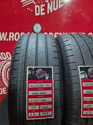 NEUMÁTICOS SEMINUEVOS Goodyear EfficientGrip Performance medida 195 55 16 91V. Ref.: 1739. 5.5/5.5 mm de profundidad. DOT de fabricación: 0521/1021. 50€ cada neumático. ENVÍO GRATIS. El precio total es de 100€. Solo se vende por parejas. Puedes comprarlo directamente desde Wallapop. Al hacer el pedido, selecciona la opción "enviar con Correos", ya que es la única paquetera con la que trabajamos. El DOT se refiere a la semana y año de fabricación de cada rueda. 195/55R16 91V.
