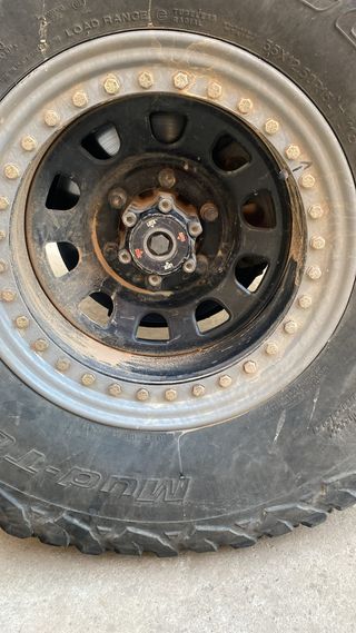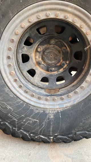 Neumáticos 35x12.50R15 con llantas beadlock en buen estado. Marca bf mud terrain al 65/70% de vida. Fabricadas en 2021. Llantas con buje nissan.