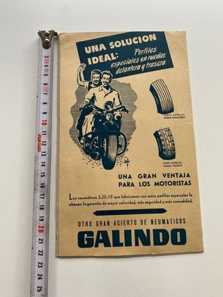 Tríptico de neumaticos Galindo, año 1951. Con tabla de dimensiones, cargas, presion , etc… Ideal para coleccionistas del sector de la moto y coche clasico. Original de época!!!