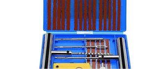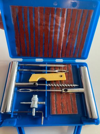 Kit para reparar pinchazos en neumáticos. - Incluye mechas de caucho. - Herramientas para inserción y ensanchamiento. - Válvula para inflado.