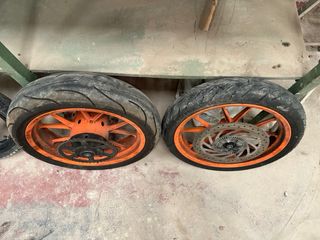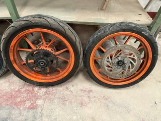 Juego de llantas completas para KTM Duke 390 del año 2014, color naranja, listas para montar. - Llantas delantera y trasera - Incluyen neumáticos. delantero 80% trasero 50% - corona cadena 2000km - Discos de freno incluidos