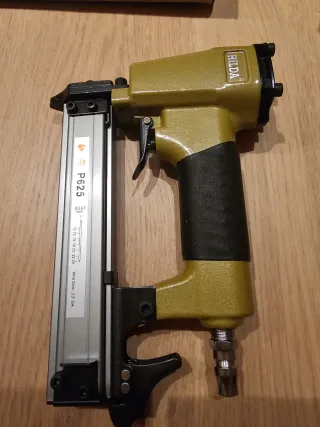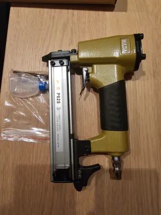 Pistola grapadora neumática de la marca HILDA. Incluye un pequeño recipiente para aceite y una llave Allen. - Modelo P625. - Color verde oliva y negro. - Conexión neumática estándar.