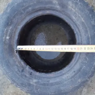 Neumático para cortacésped, desconozco medida y marca ya que estan los laterales rozados y no se aprecia. En las fotos hay medidas. El nervio de un lado esta deformado, revisar bien las fotos para ver su estado (si se monta con camara entiendo que no afectará a su buen funcionamiento) - Dibujo hexagonal. - Medida aproximada 20 cm de diámetro.