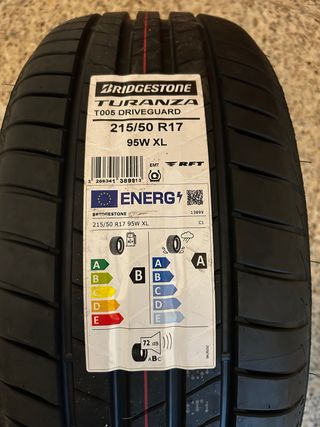** A ESTRENAR ** Juego de 2 Neumáticos Bridgestone Turanza T005 Driveguard. Runflat Fabricación Enero del 24 - Medida: 215/50 R17 - Índice de carga: 95W - Tipo: XL (Extra Load) - Tecnología: RFT (Run Flat Technology) - Etiqueta energética: C (Consumo), A (Mojado), B (Ruido) - Nivel de ruido: 72 dB