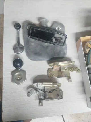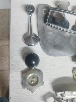Lote de piezas de recambio para Seat 600. Incluye varios componentes mecánicos y de interior. - Manivela de elevalunas. - Tapa de depósito. - Mecanismos de cerradura (2 unidades). - Depósito de goma con tapa negra. - Retrovisor interior - Pomo Seat 127