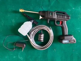 Hidrolimpiadora portátil a batería, ideal para limpiar coches o el jardín sin necesidad de conexión a manguera. - Incluye pistola, lanza, botella para jabón, filtro y cargador. - Batería de 18V y 3.0Ah.