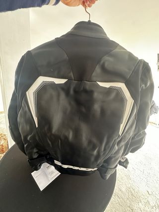 Chaqueta de cuero para moto de la marca Spidi. Diseño deportivo en color negro con detalles blancos. - Material: Cuero - Color: Negro y blanco - Cierre frontal con cremallera - Protecciones en hombros y codos - Cremalleras de ventilación en brazos y espalda - Talla 52 para hombre - Practicamente nueva 2 salidas