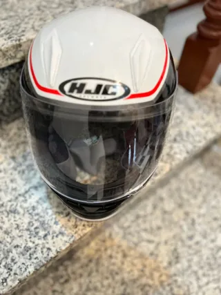 Casco de moto integral con diseño deportivo y aerodinámico. - Color blanco con detalles en negro y rojo. - Visera transparente. - Marca HJC.