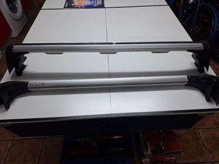 Barras de techo de aluminio para Mazda 3 del año 2015. Diseñadas para un ajuste seguro y aerodinámico. - Material: Aluminio. - Color: Plateado con detalles en negro. Están en perfecto estado.