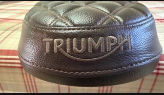 Asiento de moto de la marca Triumph, con un diseño acolchado y acabado en cuero marrón. - Material: Cuero. - Color: Marrón. - Diseño: Acolchado con costuras. - Logo: Triumph bordado.