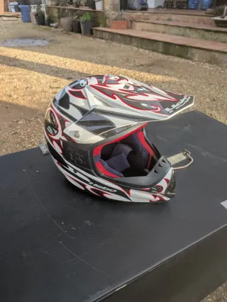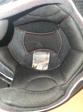 Casco de moto de la marca HEBO con un diseño llamativo. - Diseño con detalles en blanco, negro y rojo. - Interior con acolchado.