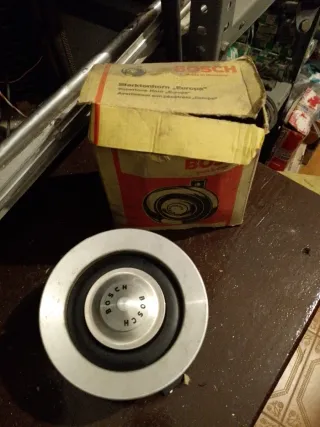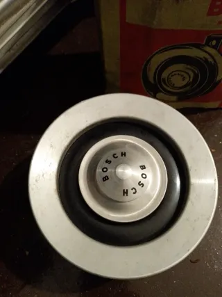 Bocina Bosch Starktonhorn Europa para coches clásicos. Un accesorio icónico para vehículos de época. - Modelo: Starktonhorn Europa - Marca: Bosch - Diseño circular metálico con detalles en negro.
