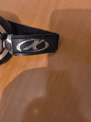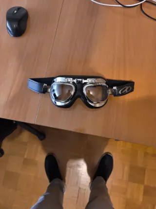 Gafas de estilo aviador con un diseño único. - Lentes transparentes. - Marco metálico plateado. - Correa ajustable de cuero negro.