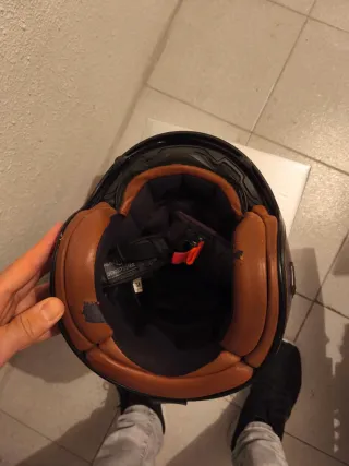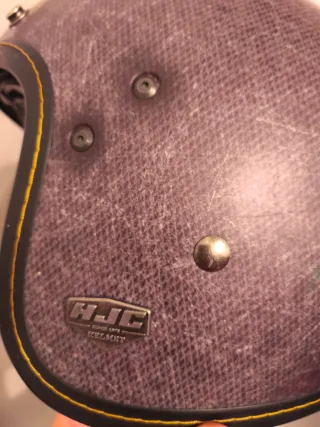 Casco de moto con un diseño texturizado. Tiene desgastes que se ven en las fotos - Marca HJC. - Detalle de remaches metálicos. - Borde con ribete amarillo. Talla M