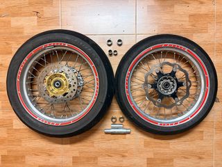 Llantas: Delantera y trasera de 17 ARKRONT. Neumáticos: Bridgestone Battlax Hypersport S20 110/70-17 140/70-17 En uso condiciones de circulación me las quito porque no tengo la moto. Disco de freno delantero y trasero así como plato de 44t. Casquillos anteriores y actuales para adaptar a creo Honda CR250 Y CRF250l seguro, casquillos externos solo L, creo que pueden adaptar con otros casquillos internos a cuál quieres ma