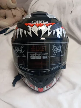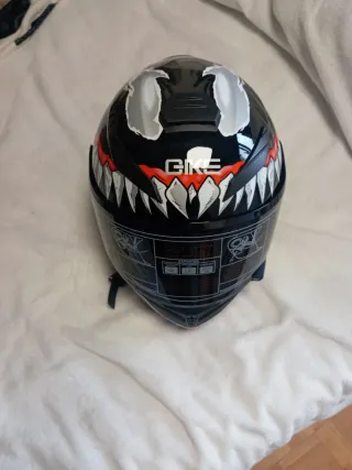 Casco de moto con un llamativo diseño inspirado en Venom. - Color negro con detalles en blanco y rojo. - Diseño de dientes y ojos característicos. - Cierre de seguridad.