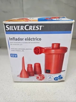 Vendo inflador eléctrico Silvercrest con adaptador para coche de 12v. Ideal para colchones, flotadores y demás artículos. Dispone de varias boquillas. Diseño compacto, no pesa y ocupa muy poco. Gran velocidad de inflado. Longitud cable 3m aprox. En buen estado (ver fotos).