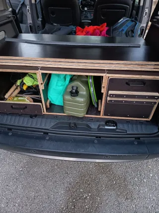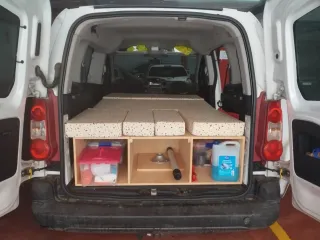Mueble a medida y colchón para adaptar tu Berlingo a camper. Valido también para peugeot rifter, Toyota proace city y Opel combo. - Mueble de madera fenolica aligerado. El mueble lleva hueco para guardar cosas de cocina y para un hornillo pequeño de cocina. Tiene un hueco para la nevera. Una pequeña despensa y cajón. Hueco en el centro para almacenar. Mesa extraíble. Accesible desde el interior del coche - Colchón a medida con cremalleras. El colchón lleva 7cm de espuma de alta densidad y 3cm de viscolastica. Muy cómodo. - El colchón lleva fundas a medida, anti manchas e impermeable (por si tienes mascota). Son fundas lavables.