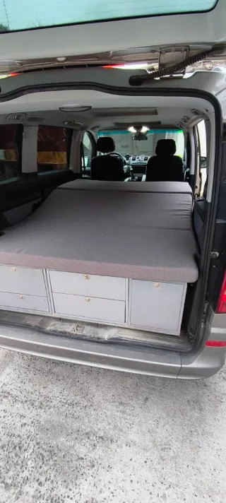 I Se vende mueble camper para VW Tiguan, con parasoles,colchon viscolastico, sillas, y un calzas para nivelar el coche. El mueble incluye una mesa que se puede sacar y un cajon. La cama dentro del coche es de 1.5m de ancho por 1.85m de largo