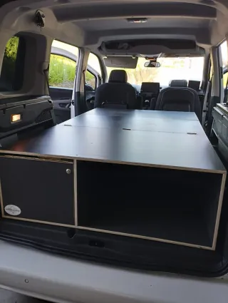 Cajón de madera para camperizar tu coche. Ideal para organizar el espacio. Perfecto para Volkswagen Caddy pero se adapta bien a otras furgonetas. Al desplegarse queda una cama de 2mx1,40m(en su parte más ancha). - Construcción en chapón marino con tratamiento impermeable. - Diseño funcional para almacenamiento, con mesas desplegables. - Se entregan también: oscurecedores para todas las ventanas hechos a medida y con bolsillos de almacenaje y los colchones con funda lavable y de material viscoelástico hechos a medida. No hago envíos.