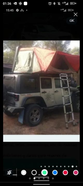 Vendo tienda de techo rígida rápida usada poco, tipo Ikamper, para 4 personas, con escalera telescópica incorporada, con colchón y ventanas con mosquiteras y oscurecedor, en tela impermeable y transpirable. En el precio va incluída la VACA DE BARRAS DE ALUMINIO para sujetarla al coche en los rieles del vierte agugas + TOLDO de 2m de ancho x 3,5m de largo. Está en Cubellas lista y preparada para ya poner en el techo sobre las medidas del techo de los vierte aguas de un Jeep Wrangler Unlimited, pero se puede adaptar a las medidas de ancho de techo de otros vierte aguas etc Duerme donde quieras sin reservas de hoteles, y a tu aire.