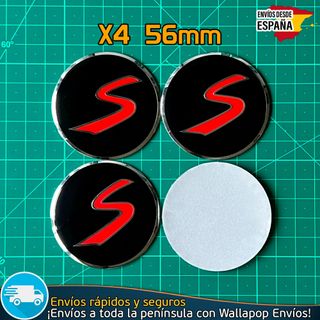 Pack de 4 pegatinas adhesivas de 56 mm para tapas centrales con el emblema, insignia, logo, anagrama de Mini Cooper Sport S. Ideales como recambio para los centros de ruedas, tapabujes, tapacubos y llantas de tu vehículo. Compatibles con modelos como: Mini, S, Paceman, Clubman, Countryman, Cluman y más. Material: Aluminio con relieve de excelente calidad, acabado y durabilidad. Contenido: 4 pegatinas de 56 mm con el emblema S de Mini. Color: Logo rojo con relieve cromado y fondo negro.