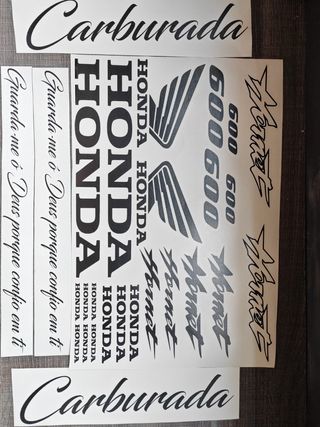 Pegatina de vinilo para motocicleta Honda Hornet 600 Medida:30 cm (la parte más grande) Grosor:0,3 mm Material:Vinilo de alta calidad resistente al agua y al sol. Características:Fáciles de despegar y no deja residuos adhesivos. Posibilidad de elegir otras medidas, colores y diseños.