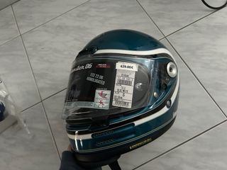 Casco integral para moto con diseño clásico, con pegatinas. Incluye pantalla transparente protectora.