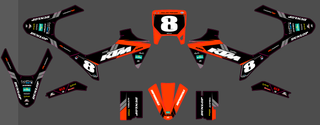 Kit de autocolantes para KTM SX e2. Inclui vários autocolantes com logos e números. Personalizados a gosto de cada uno. - Autocolantes com logos Dunlop, GoPro, KTM e outros. - Inclui o número 8 em destaque. - Design com cores laranja, preto e cinza.