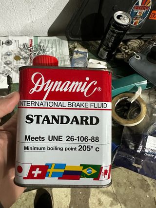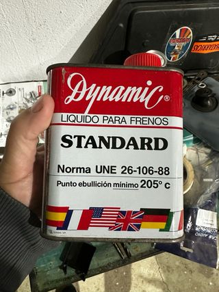 Lata de líquido de frenos Dynamic Standard. - Formato de lata metálica. - Diseño vintage. - Cumple norma UNE 26-106-88. - Punto de ebullición mínimo 205°C.