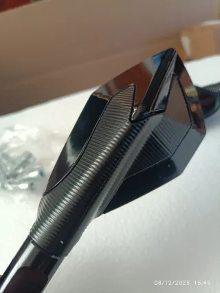 Set de dos espejos retrovisores universales para motocicleta. Fabricados en aluminio negro con un diseño angular. - Material: Aluminio. - Color: Negro. - Incluye tornillería para su montaje.
