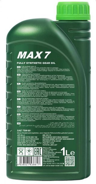 2 botellas de 1L. Aceite para transmisión manual FANFARO MAX 7. - Grado de viscosidad: 75W-80. - Clasificación API: GL-4. - Tipo de aceite: Gear Oil. - Para cajas de cambio manual BMW MTF LT-1, BMW MTF LT-2, BMW MTF LT-3, BMW MTF LT-4, Ford WSS-M2C200-D2, MB 235.10, Mitsubishi MZ312644, Nissan 999MP-MTF20P, Nissan KE91699932R, PSA 9730 A2, PSA 9730 A8, PSA B71 2330, Toyota JWS 227, VW G 009 317, VW G 052 171, VW G 052 178, VW G 052 512, VW G 052 527, VW G 052 532, VW G 052 726, VW G 052 798, VW G 055 726 |