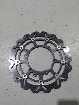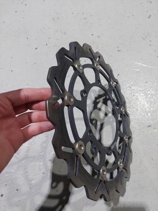 Disco delantero flotante sobredimensionado floreado marca KTM original como nuevo, sin holguras, muy poco uso demostrable, modelo con referencia Nº 58609060000 sustituida por Ref.Nº 25009260000. Especial para supermotard. Disco flotante de acero inoxidable. Para ahorrar peso, el interior es de aluminio. El punto de presión es el mismo, incluso a altas temperaturas o intenso trabajo. Diametro exterior 310 mm, practicamente mismo tamaño que el tipico de 320 mm. Gran espesor de 5mm. Se puede montar en todas las KTM EXC y SX.