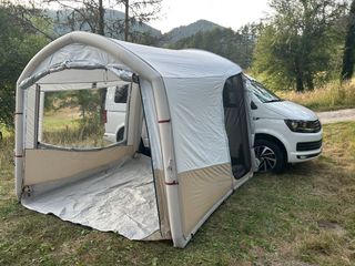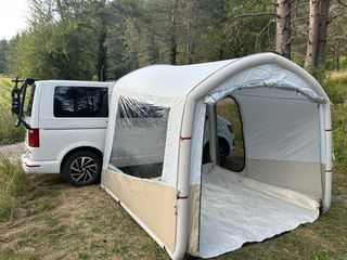 Avance hinchable de color blanco y beige, diseñado para acoplar a furgonetas. Ideal para comer, cenar, una buena sobremesa para resguardarte del sol, viento incluso lluvia. Muy fácil de montar y desmontar. - Estructura hinchable. - Ventanas transparentes. - Mosquiteras en la puerta. - Suelo desmontable. - Hinchador incluido. Usada una sola vez, esta nueva. La vendo por haber vendido la furgo.