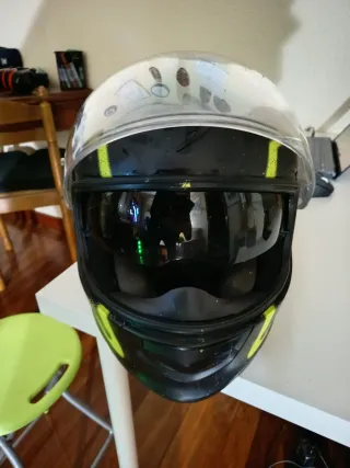 Casco de moto Scorpion en talla L. Diseño deportivo en negro con detalles en amarillo neón. - Visera transparente. - Cierre de seguridad. - Interior cómodo.