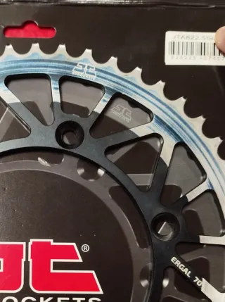 Corona JT de aluminio para moto, con 51 dientes. Ref: JTA822.51BLK - Diseño ligero y resistente. Tiene poco uso, solo rozada por el exterior por el patín de la cadena, no tiene golpes, mirad los dientes están en perfecto estado. Se vende a mitad de precio, descuento del 50%.