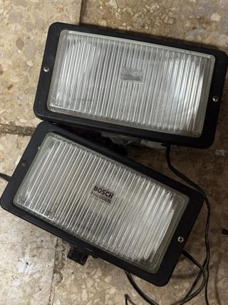 Se venden dos focos halógenos de la marca Bosch. - Diseño rectangular con carcasa negra. - Lente de cristal estriado.