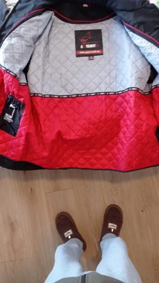 Chaqueta de invierno para motorista, con un diseño moderno y acolchado. - Interior con forro acolchado en color rojo y gris. - Etiqueta interior de la marca GOYAMOTO. - Bolsillo interior con cierre de cordón.