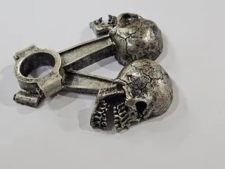 Emblema decorativo con diseño de pistón y calaveras en 3D. Muy detallado Fabricado con un plastico de poliresina dura. Desiñado para aplicacion interior y exsterior. Dimensiones: ancho 10,16cm alto 10,16cm.