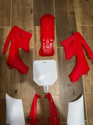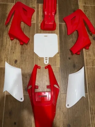 Kit completo de plásticos para moto en colores rojo y blanco. - Piezas de plástico para la carrocería. - Incluye guardabarros y tapas laterales. Kit completo de plásticos para mini pit bike tipo Apollo y Orión 50. Aleta trasera, delantera,molduras depósito,tapas laterales y careta frontal.Longitud aleta trasera,39 cm.Delantera,32,50 cm.Consultar resto de medidas.