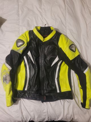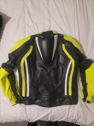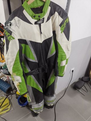 Se vende mono de cuero de 2 piezas. Pantalón talla XXL y Chaqueta talla XL, aunque talla bastante pequeño y realmente el conjunto es talla L-Xl. Unión chaqueta y pantalón por cremallera en la espalda. Protecciones en hombros y rodillas de titanio. Chaqueta con joroba protectora Deslizaderas Shocks. Chaleco interior desmontable para invierno. Tiene muy poco uso pero si tiene una caída con PitBike. Antebrazo y hombro derecho con daños (Foto 5). Pierna izquierda rozaduras al haber rodado con la deslizadera mal colocada (Foto 6). Regalo guantes a juego (Foto 7). Se vende por venta de Pitbike. No negociable. No cambios. Hago envíos.