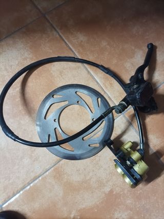 se vende freno delantero de de moto de ccros pequeña montado en una imr eléctrica apenas sin uso completo con disco bomba de frenos pinza y latiguillo válido para montar en motos pequeñas de niños que la mayoría vienen con freno de cable cros pit bike