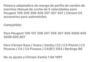 Nuevo a estrenar Para Peugeot: 106 107 206 207 306 307 308 3008 406 5008 605 807 Para Citroen: Saxo / Xsara / Xantia / C2 / C3 Pluriel / C3 Picasso / C4 / C4 Picasso / C4(B7) DS4 / Berlingo B6 etc…. Fácil instalación. Simplemente tire de la perilla vieja, mantenga la manga de plástico blanca en el eje gearstic, luego empuje la nueva. Envíos a domicilio por Wallapop