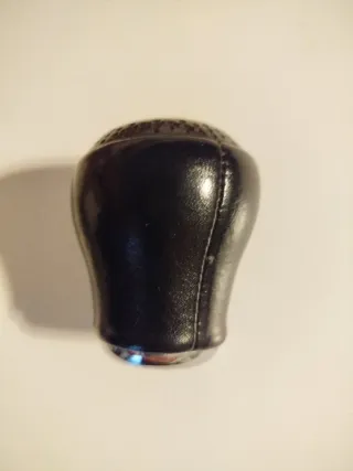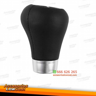 Pomo de cambio de marchas con acabado en cuero negro y detalles metálicos. - Material: Cuero y metal. - Color: Negro y plateado. - Diseño elegante.