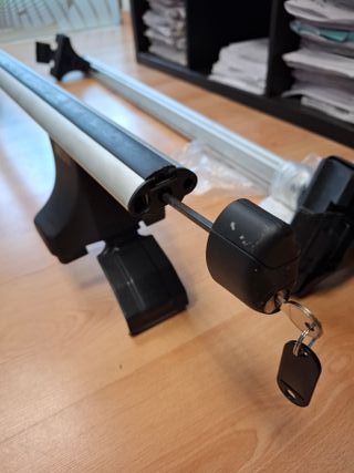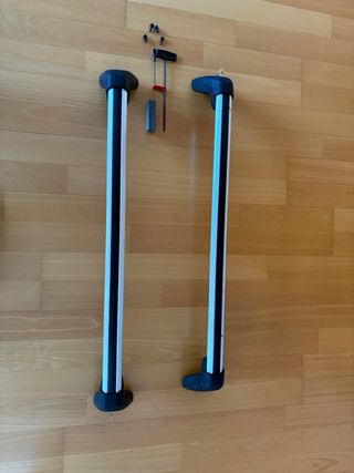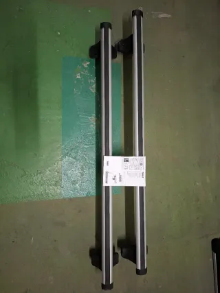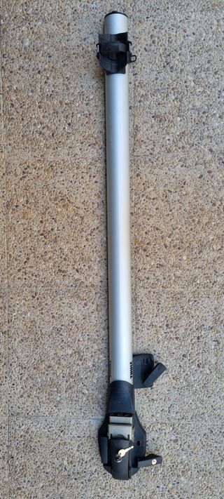 Se venden dos barras portaequipajes Thule para coche. Están en buen estado, aunque muestran algunas señales de uso. - Son barras de aluminio de color gris plata. - Incluyen un sistema de fijación. - Ideales para transportar bicicletas.